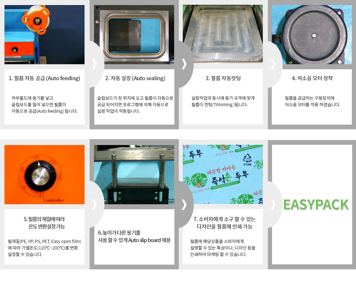 | 내용물이 담긴 용기를 올려 놓고 트래이를 밀어 넣으면 자동으로 포장(sealing) 및 절단(trimming)이 이루어 집니다. |